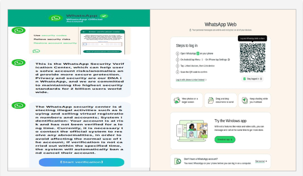 HackOnChat is a sophisticated scam that tricks WhatsApp users into giving up access to their accounts. It works by creating fake WhatsApp Web login pages that look almost identical to the real thing. Imagine you get a message from a friend, or even a WhatsApp notification, telling you that your account needs to be verified. The link might look official and might even come with a fake security warning. Once you click it, you’re sent to a fake page designed to steal your WhatsApp login details or hijack your session.